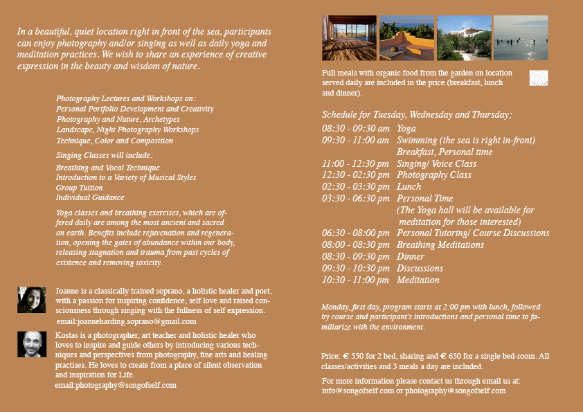 Whether you are interested in photography, singing or yoga techniques this retreat is designed to create the space for the you to enjoy and absorb nature while you develop your artistic expression.