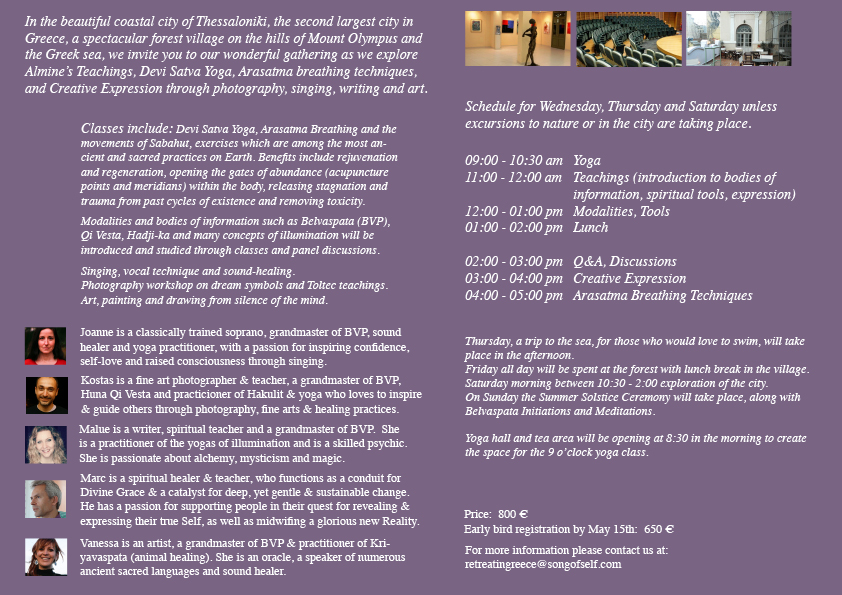 Payment option for this event is now available only through contacting us via email. Please contact us at retreatingreece@songofself.com for confirmation of the event.